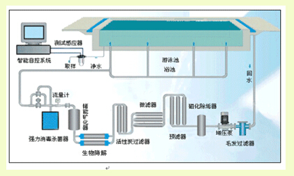 3. 在國外發(fā)達地區(qū)和我國奧運水立方場館水處理技術中則利用高精度組合式仿凈水處理系統(tǒng),它的處理流程為:池水 → 毛發(fā)預濾 → 細度石英沙過濾 → 活性炭吸附 → 超濾 → 臭氧殺菌消毒 → 凈水。
